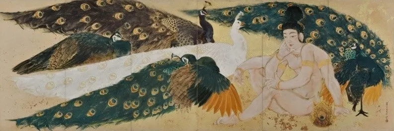 例えば、《やすらい》(1958年)は、高野山にある快慶作の《孔雀明王》を模写しています。この作品は、従来の仏画の枠を超え、龍子自身の独自の解釈が盛り込まれています。高野山の神秘的な空気を感じさせつつ、焦点を当てたその対象に新しい息吹を吹き込んでいます。