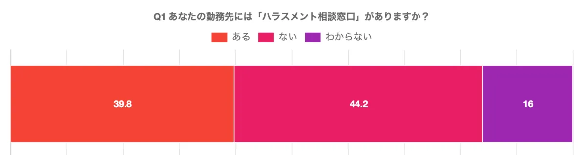 調査結果では、39.8%の人が勤務先にハラスメント相談窓口が「ある」と認識していることが分かりました。しかし、多くの人が「ない」と答える一方で、その内容を「わからない」と応じた人も16.0%に達しています。これは、制度が整備されているにもかかわらず、十分に浸透していない現状を浮き彫りにしています。
