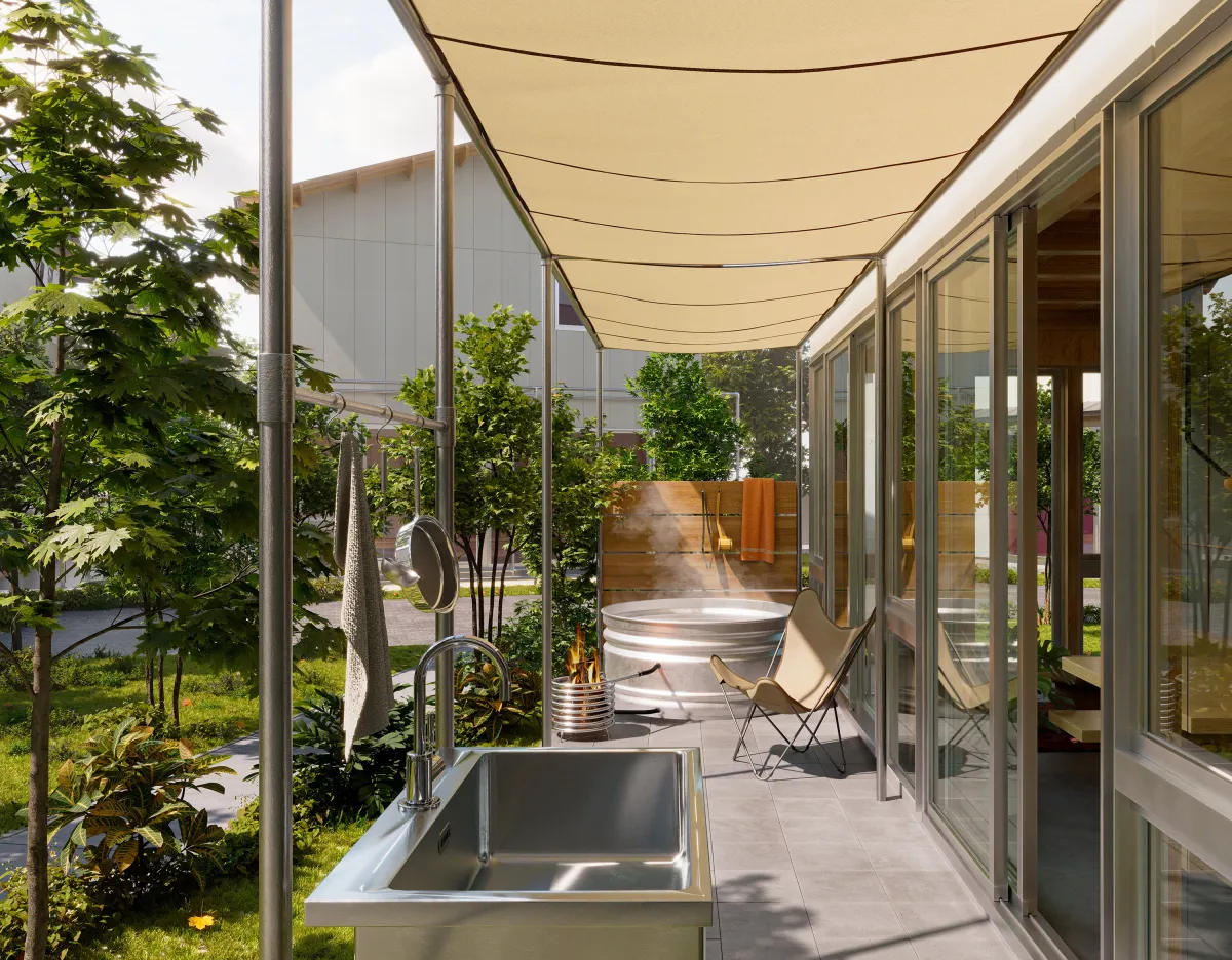 - - テラスにはカスタマイズ可能なスチール製フレームを設置し、日除けや目隠しとしても使えるデザイン。