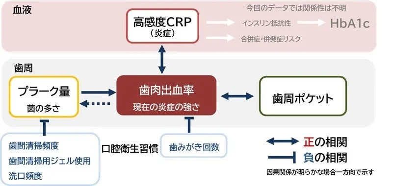 血液指標の影響: HbA1cや高感度CRPの値が高い患者は、プラークコントロールが良好でも歯ぐきの出血率が高くなることが示され、これによって糖尿病患者に特有の管理方法が求められるようになりました。