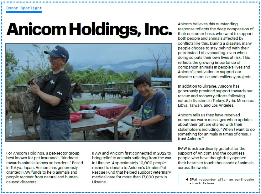 アニコム ホールディングス株式会社では、災害時における動物の支援活動を積極的に行っています。特に、自然災害や人為的な災害が発生した場合、アニコムは海外の動物たちへの寄付を募り、国際動物福祉基金(IFAW)を通じて支援を行っています。最近、アニコムはIFAWのニュースレター『Insider Update 2nd Edition 2025』で特集され、同社の寄付活動が「Donor Spotlight」のコーナーで紹介されました。
