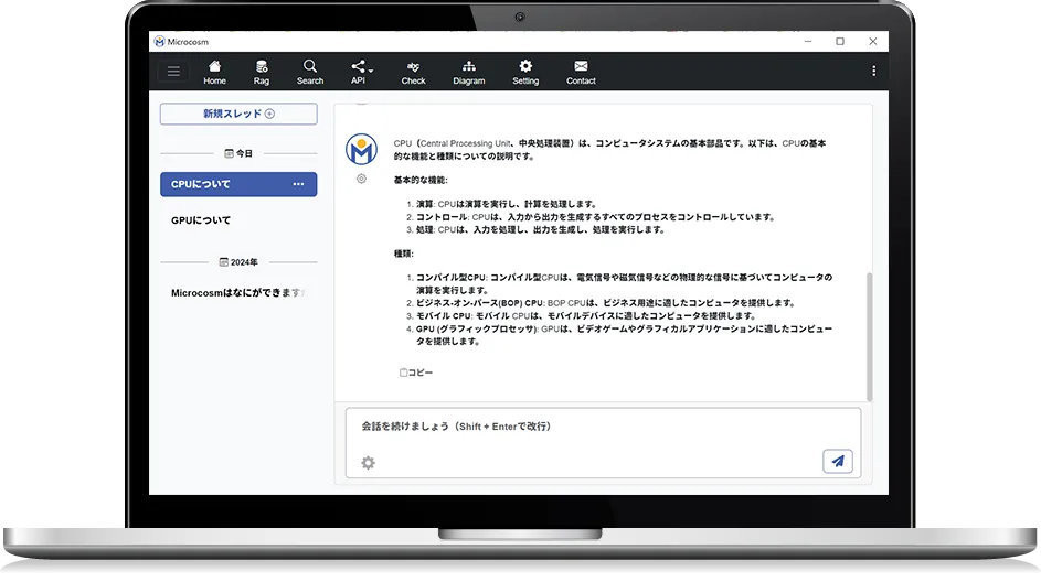 独自に最適化されたRAG機能は、90%以上の高精度を誇ります。社内データに基づいた正確な回答をAIが瞬時に提示し、情報検索にかかる時間を大幅に削減します。