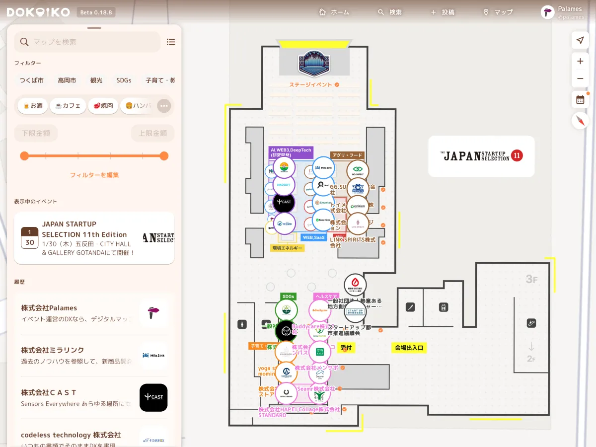 Palamesは、同イベントのために、革新的なデジタルマップを制作しました。このマップを利用することで、来場者はイベントを効率的に探索できるようになります。フィルター検索機能を搭載しており、興味のある出展者やブースを簡単に見つけることが可能です。
