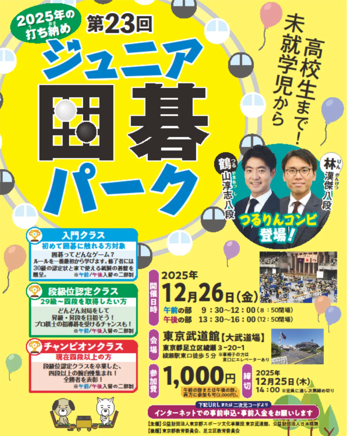 日時は12月26日(金)、会場は東京都足立区綾瀬に位置する東京武道館の大武道場。この特別な日には、プロ棋士による囲碁教室や段級位の認定、そして上級者同士の交流戦など様々な内容が用意されています。