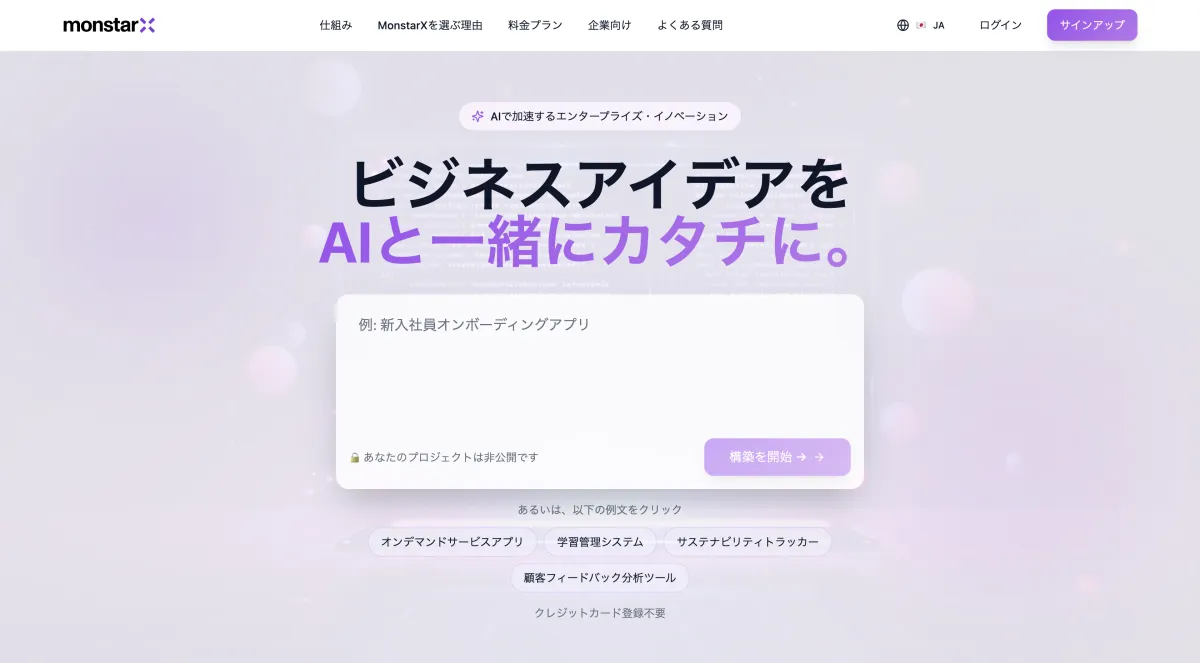 このような課題を解消すべく誕生したのが『MonstarX』です。このプラットフォームは、複雑なプロンプトを必要とせず、対話形式でアイデアを整理し、実現可能な形にすることができる仕組みを提供しています。誰もが自分のアイデアを簡単にプロトタイプ化でき、チーム内で容易に共有できることで、効率的な意思決定とプロジェクトのスピード感を実現します。