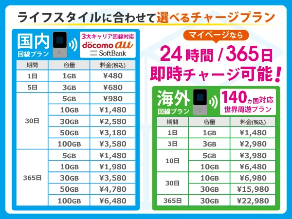 従来の月額契約と異なり、利用者は契約や解約手続きを気にすることなく、端末を購入するだけでもWi-Fi環境を利用できるのが魅力です。データプランの追加も、必要に応じて1GBから100GBまで簡単にチャージ可能で、利用は365日以上に対応しています。これにより、旅行の際や一時的な回線が必要な時など、様々なシーンで自由に通信サービスを利用しやすくなっています。