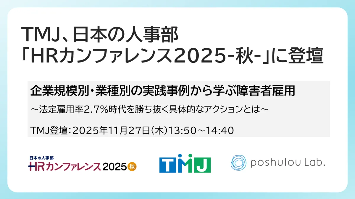 株式会社TMJは、コンタクトセンター及びバックオフィス業務の構築と運営を手がける企業であり、2025年に予定されている法定雇用率の引き上げを見据えた取り組みを強化しています。この度、TMJは日本最大の人事イベントである「HRカンファレンス2025-秋-」において、障害者雇用をテーマにしたセッションを行います。このカンファレンスでは、企業が抱える人材マネジメントの課題に対して最新情報や実践事例を提供します。