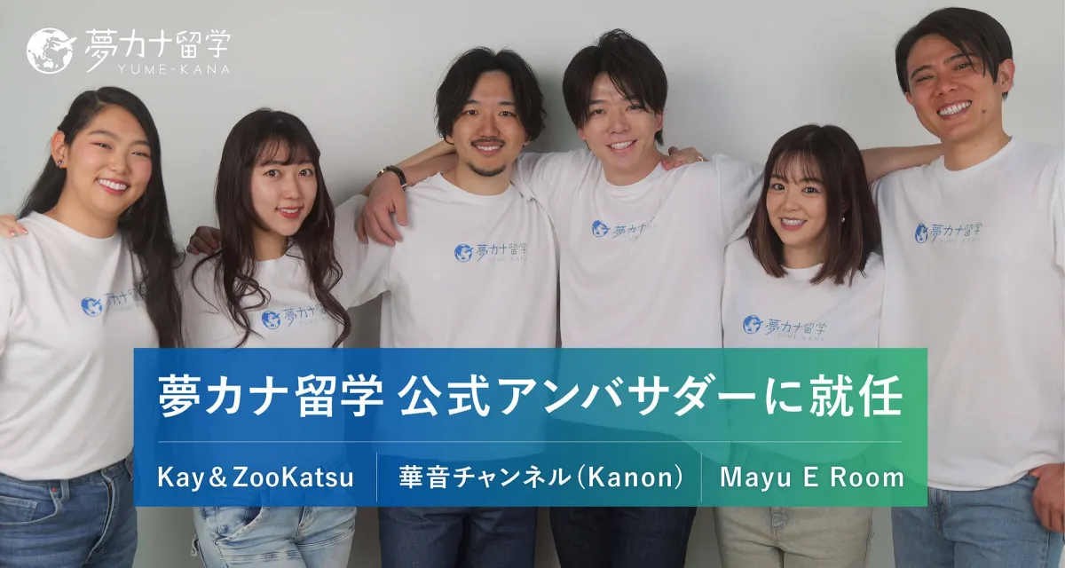 留学エージェント「夢カナ留学」が新たに人気YouTuberの華音(かのん)、Mayu(まゆ)、Kay&ZooKatsu(けい&ずーかつ)の三組を公式アンバサダーに任命したと発表しました。彼らは総SNSフォロワー数が150万人を超える影響力を持ち、留学業界のリアルな情報を広める存在となります。