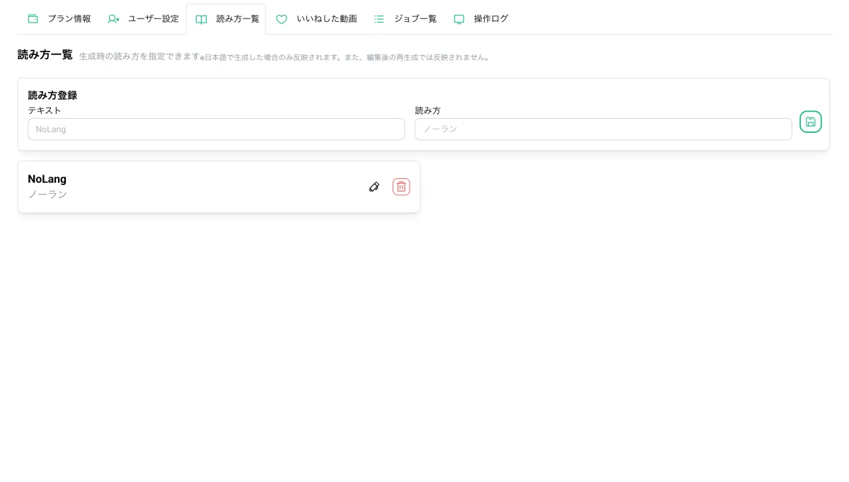 辞書機能の利用は非常に簡単です。まず、「NoLang」のマイページにアクセスし、読み方一覧タブからテキストと読み方を入力。緑色のボタンをクリックすると登録が完了します。この機能により、読み方の正確性や音声の質が飛躍的に向上します。さらに、登録内容はいつでも編集や削除が可能です。
