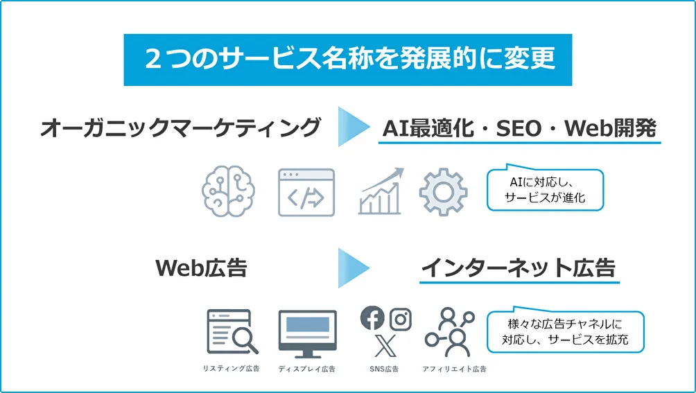 近年、リスティング広告やディスプレイ広告に加え、SNS広告やアフィリエイト広告の需要が高まっています。この流れに応じて、ジオコードは新たなサービス名称へと進化することを決定しました。これにより、広告運用の選択肢をさらに広げ、各種媒体を使った効果的なマーケティング展開を行います。