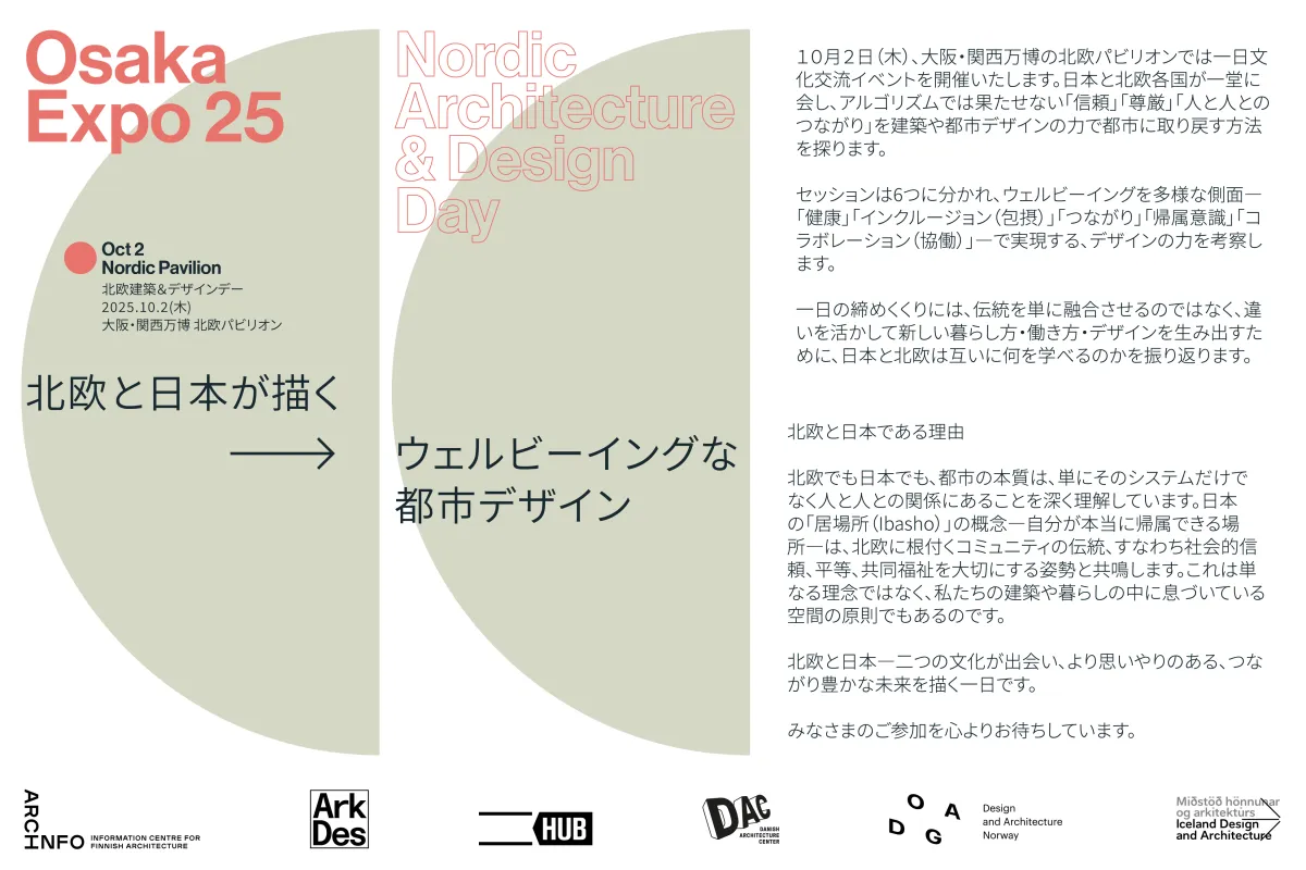 2025年10月2日、大阪・関西万博の北欧パビリオンで「Nordic Architecture & Design Day」が開催されます。このイベントは、日本と北欧が協力して、より良い都市デザインを目指す取り組みです。特に注目すべきは、株式会社SIGNINGとデンマークのBLOXHUBが共同企画した「Wellbeing as Belonging(ウェルビーイング=帰属意識)」というセッションです。