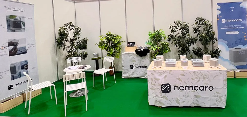 その名前「nemcaro」は、九州の方言で「眠かろ(眠たいでしょう)」に由来しています。このブースは、観葉植物やウッドテーブル、ナチュラルカラーのテーブルクロスを使用し、開放感あふれるデザインで、まるで森林の中にいるかのような心地よい空間を演出しています。