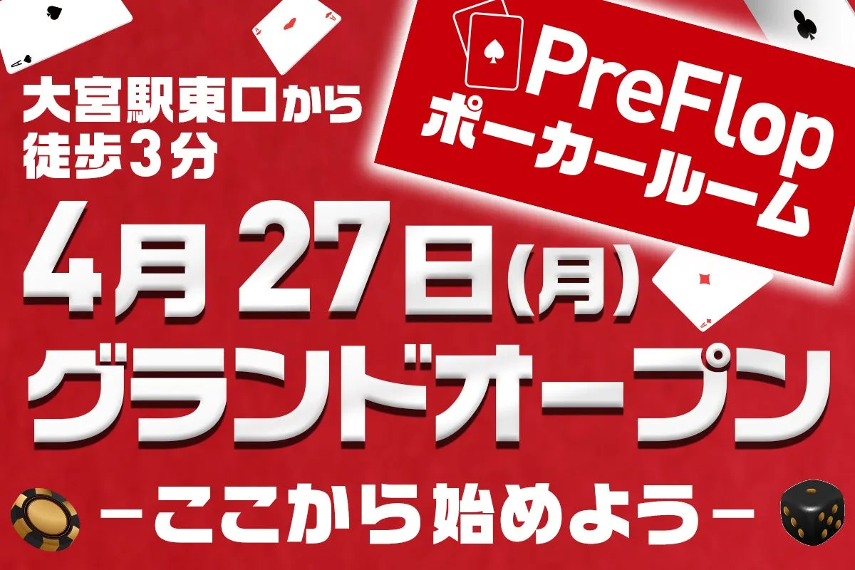 ポーカールーム「PreFlop 大宮」のオープン日は2026年4月27日14:30からの予定で、興味がある方は事前の予約をお勧めします。特にトーナメント参加やリングチップのストックを希望する方は、Waitinglistへの登録が必要です。