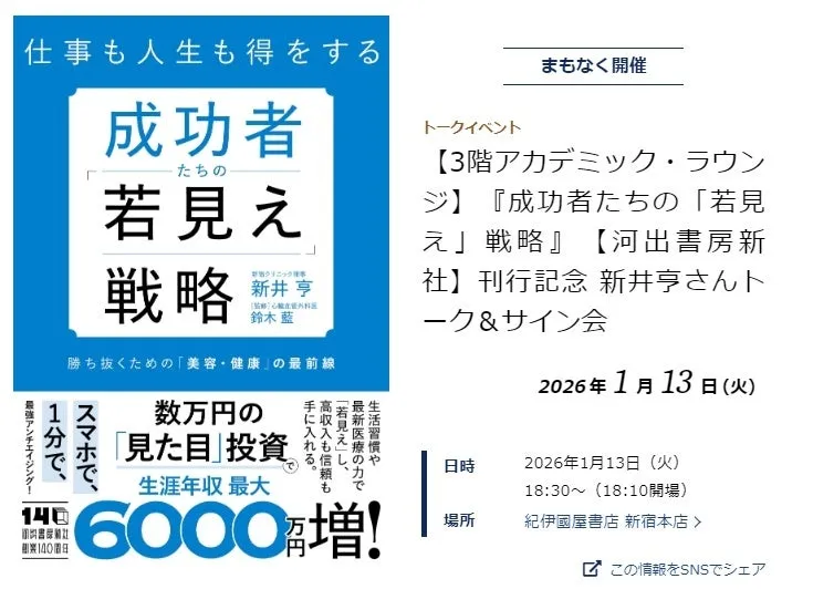 新井亨氏が医療法人の理事として、注目のイベント『成功者たちの若見え戦略』の出版記念トークを、2026年1月13日(火)に紀伊國屋書店新宿本店の3階アカデミック・ラウンジで開催します。本イベントは無料で参加でき、仕事帰りにも立ち寄りやすい時間設定となっています。