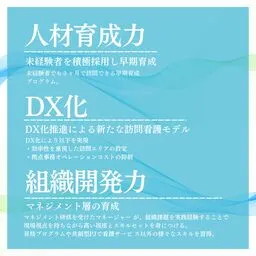 人材育成力:同社では訪問看護未経験者を対象とした「早期育成プログラム」を導入。入社後わずか3ヶ月で独り立ちできる体系を整えており、心の安全性を担保しつつ、高品質なサービスの提供が促進されています。