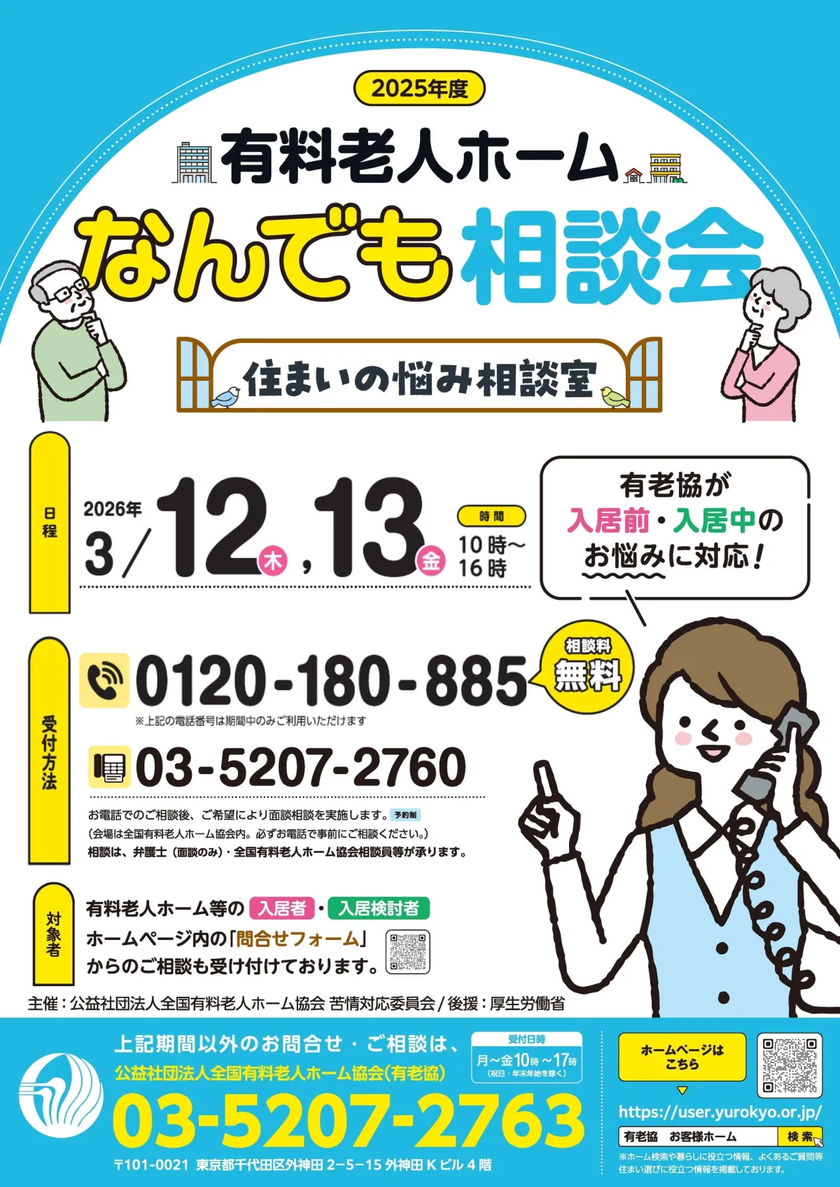 高齢者の住まい選びは一大事。公益社団法人全国有料老人ホーム協会が主催する「有料老人ホームなんでも相談会」が、2026年3月12日(木)・13日(金)の2日間、特別に開催されます。今回は、住まいに関する悩みや疑問を解消するための貴重な機会です。