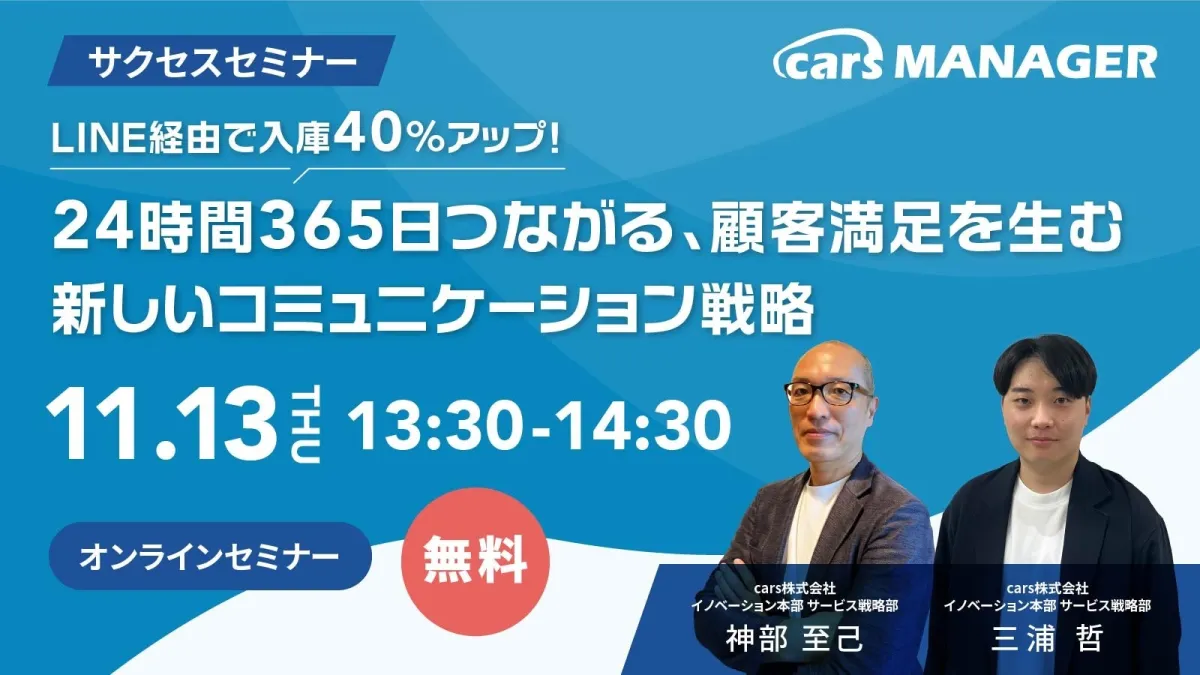 例えば、電話がつながらない、営業時間外の問い合わせに対応できずに困っている、というお悩みを持つ方も多いのではないでしょうか。そんな状況を打開すべく、cars株式会社が提供する【サクセスセミナー】が11月13日(木)に開催されます。このオンラインセミナーでは、LINEを活用して入庫率を40%も増加させた実践的な手法を学ぶことができます。