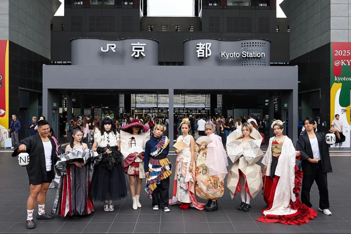 当日は、アップサイクル着物を身にまとったCGOギャルたちが京都駅構内を練り歩き、華やかでポジティブなエネルギーを振りまきました。伝統的な着物に現代の感覚をミックスさせたスタイリングは、観る者に強い印象を残しました。ギャルたちの姿は、古い文化を尊重しながらありながらも、新しい風を吹き込む役割を果たしていました。