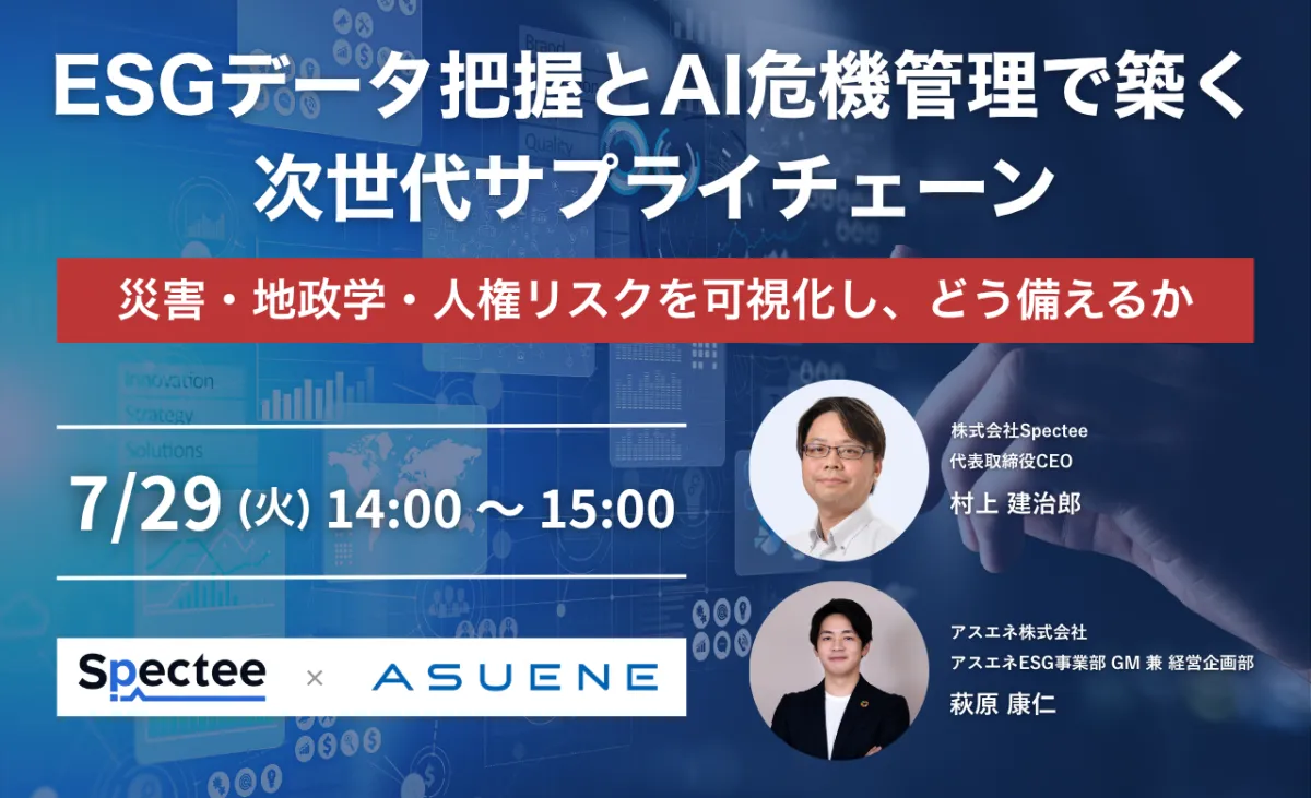 サプライチェーン関連業務に従事されている方々に特別な機会が訪れます。2025年7月29日(火)、株式会社Specteeとアスエネ株式会社の共催で、特別なオンラインセミナーが開催されます。このセミナーのタイトルは「ESGデータ把握とAI危機管理で築く次世代サプライチェーン」。