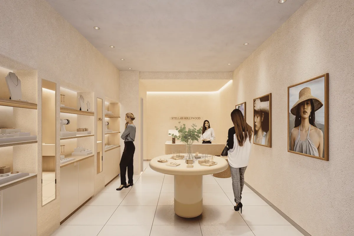 STELLAR HOLLYWOOD 表参道店は、内装を全面的に見直し、明るく洗練された印象を与えます。新しいライティングやディスプレイの配置により、各アクセサリーの特長が際立つよう設計されています。この店舗は、初めての方でも気軽に立ち寄りやすく、リラックスして商品を楽しんでいただけるよう配慮されています。上質さを大切にしつつ、多くの方々に楽しんでいただけるスタイルに進化しました。