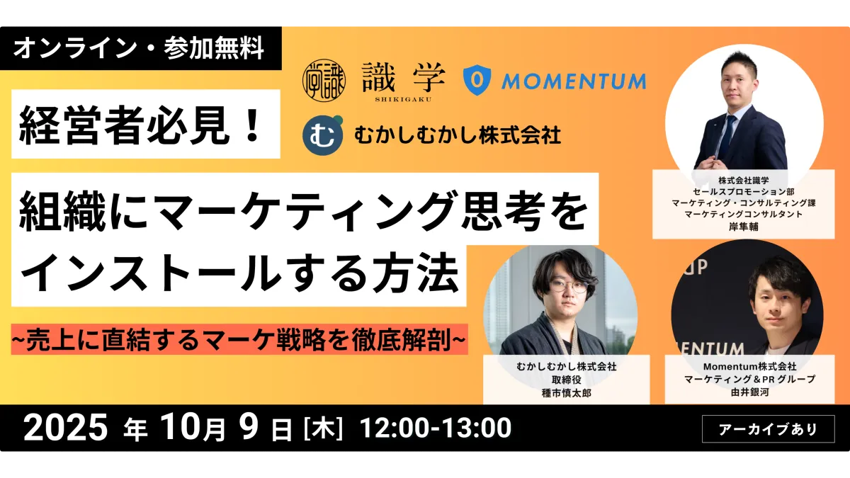 Momentum株式会社が主催するオンラインウェビナー、【経営層・マーケ責任者様向け】『組織にマーケティング思考をインストールする方法』が2025年10月9日(木)に開催されます。このウェビナーでは、売上や利益を向上させるためのマーケティング思考を組織内に定着させる方法が、専門家の情報を交えながら紹介されます。