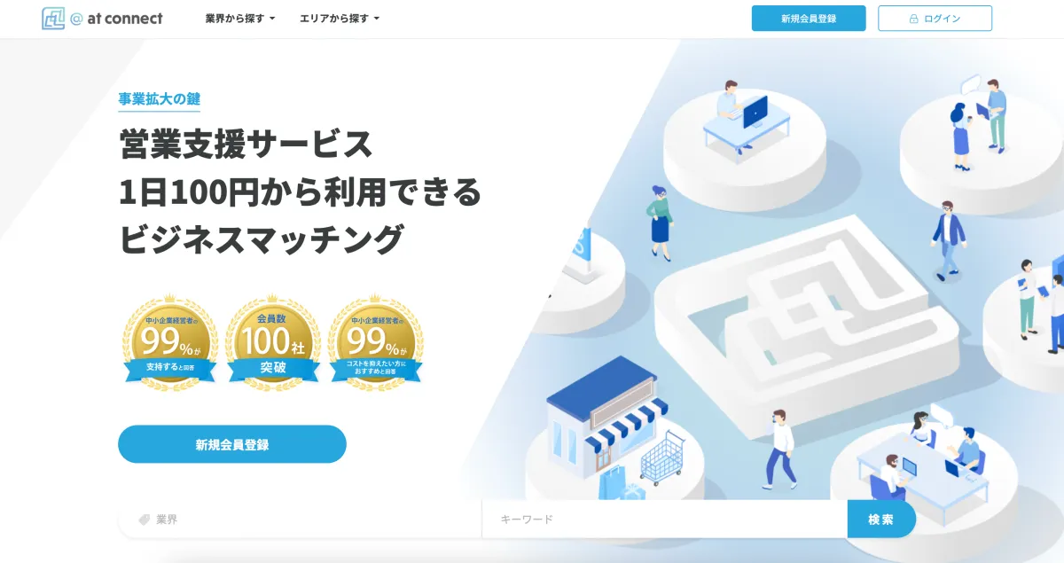 『@at connect』は、低価格で安心できる営業支援を目指します。月額わずか3,000円で企業情報を掲載し、業界や地域を検索して出会いたい企業にアプローチが可能です。営業が苦手な方のサポートを行い、企業の課題や悩みを解消する手助けに取り組みます。