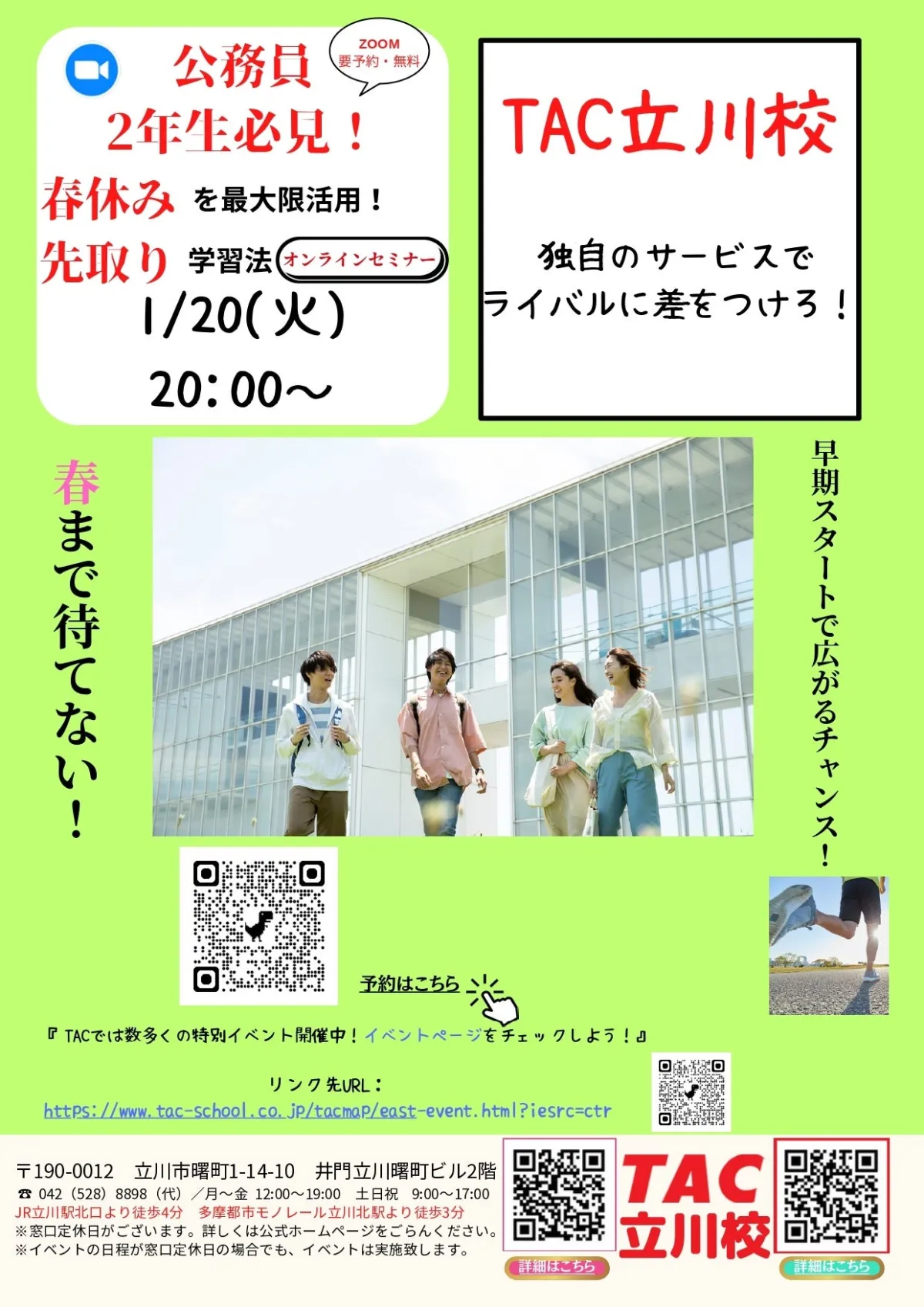 TAC公務員立川校が、2026年1月20日(火)20:00からオンラインにて大学2年生を対象とした特別なセミナーを開催します。今回は、新たに導入された公務員試験の受験方式や、セミナー独自のサービスについて詳しく解説いたします。