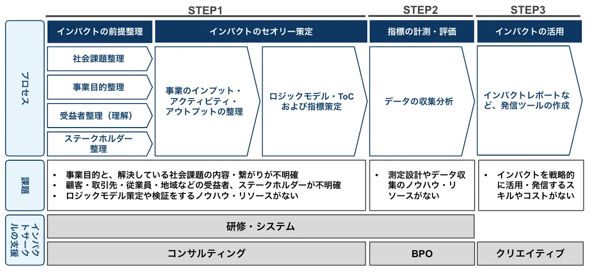 最初のステップでは、コンサルティングを通じて、社会課題や事業目的、ステークホルダーを整理します。ロジックモデルや指標の設計を行い、企業の活動を体系的にまとめることができます。また、社内向けの研修も行い、キャパシティビルディングにも寄与します。