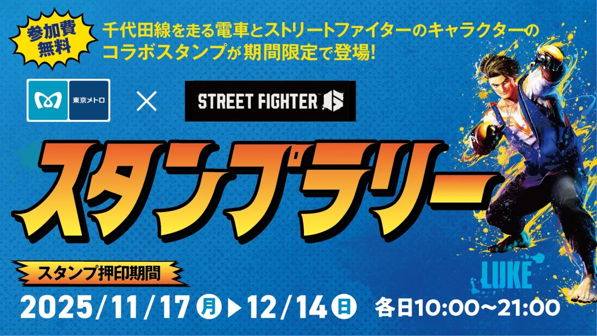 2025年11月17日(月)から12月14日(日)にかけて、三井ショッピングパーク ららテラス北綾瀬にて「東京メトロ×STREET FIGHTER 6スタンプラリー」が開催される。このイベントでは、人気ゲーム「STREET FIGHTER 6」のキャラクターたちと共に、東京メトロの千代田線とコラボしたスタンプラリーに参加できる。また、スタンプを集めることで、様々な特典も獲得することができる。