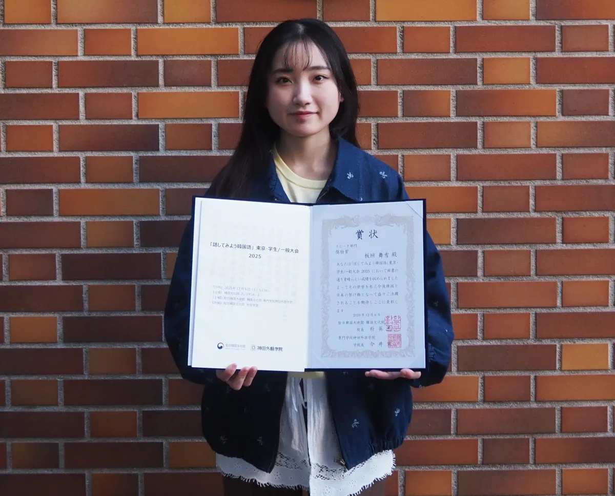 「スピーチの主人公である韓国人の友人や多くの方の協力のおかげで、このような良い結果を得られた」と受賞後にコメントした板垣さん。彼女は、大学生活の集大成として思い入れのあるスピーチを行えたことに喜びを語りました。そして、今後も韓国語を中心に、さまざまな分野に挑戦し続け、日本と韓国の架け橋となる存在になりたいという目標を持っています。