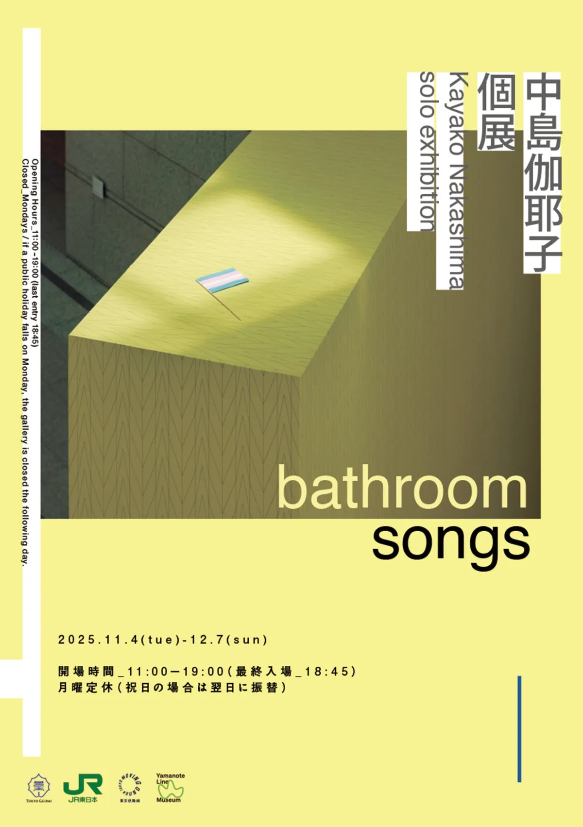 2025年11月4日から12月7日には、中島伽耶子の個展「bathroom songs」が開催されます。本展では、インスタレーション形式で、トランスジェンダー差別についての問いかけを行う作品が展示される予定です。彼女の作品は、空間と作品が一体化することで、観る者に深いメッセージを届けます。