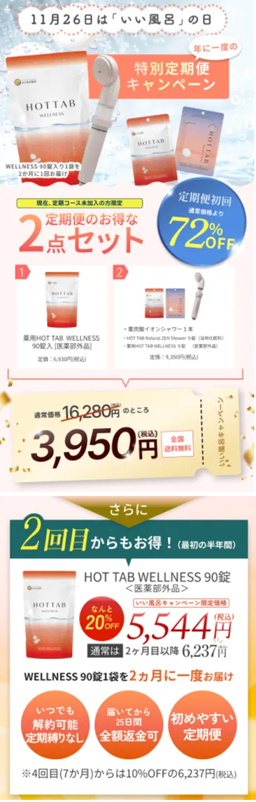 家族みんなで使いやすいホットタブは、特に「ホットタブ WELLNESS」や「ホットタブ RECOVERY」という特別定期便コースで、健康を手軽にサポートします。2ヶ月に一度届けられるこのプランは、入浴の楽しさを継続的に提供してくれます。