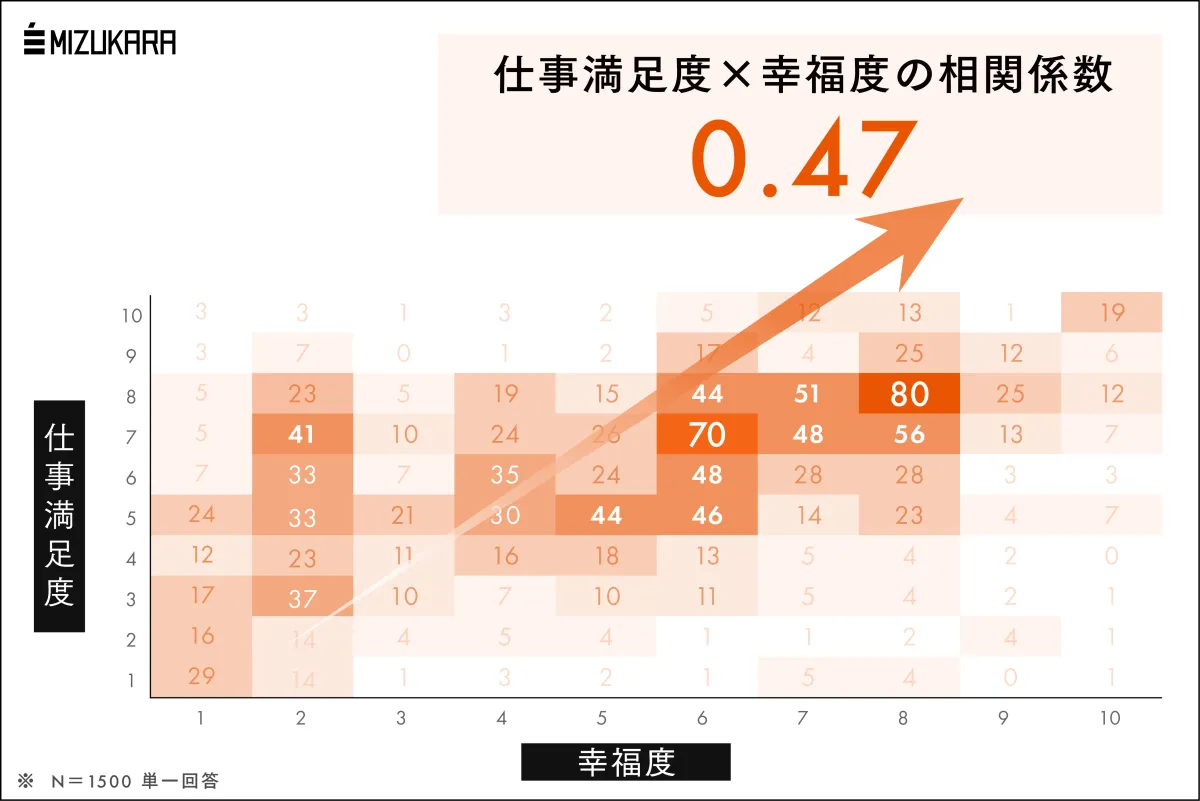 株式会社ミズカラが実施した調査によると、仕事に対する満足度と人生の幸福度の間には、相関係数0.47という強い関連性があることがわかりました。この結果は、より多くの時間を投じる「仕事」が、私たちの人生にどう影響しているのかを考察する手がかりとなります。