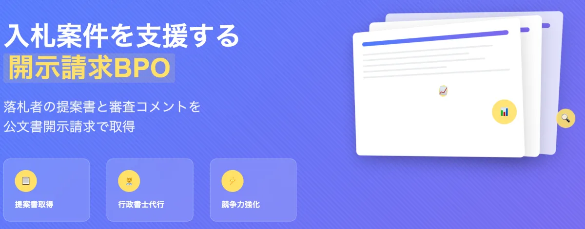 新しい「開示請求BPO」は、行政書士と連携して公文書開示請求業務を代行します。このサービスでは、落札者の提案書や審査員の議事録などを合法的に取得し、次回の入札に向けた戦略を立てるうえでの貴重な情報を提供します。具体的には、以下のような特徴があります。