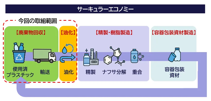 今後、CFP社で生成された油を元に、三井化学グループがプラスチックを生産し、それをキッコーマングループの新しい容器包装材として活用する方針も進めています。