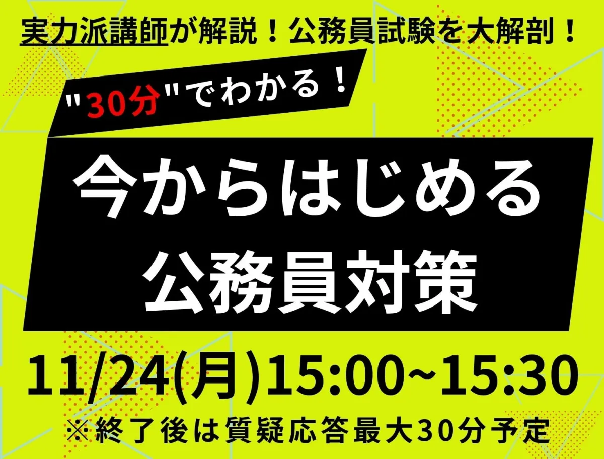 公務員を目指す皆さん、11月24日のこのセミナーで新たな一歩を踏み出してみませんか?公務員試験に向けた不安を解消し、スムーズにスタートを切るためのヒントが満載です。興味のある方は、ぜひご予約をお忘れなく!