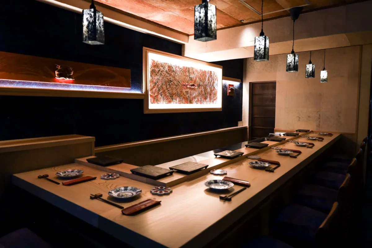 今回のリニューアルで注目すべきは、光と影が交錯するカウンター空間です。既存のカウンターは、穏やかな木の温もりが感じられ、明るさを持った“古き良き鮨屋”の趣が漂います。それに対して、新設されたカウンターは、和モダンなアプローチで、抑えられた照明が作り出す凛とした静けさが特徴です。この二つの空間は背中合わせに存在し、訪れる人々はそれぞれの雰囲気を楽しむことができます。こんな場所で、鮨を味わいながら、一つの作品が創られていく様子を見ることは、何物にも代えがたいエクスペリエンスです。