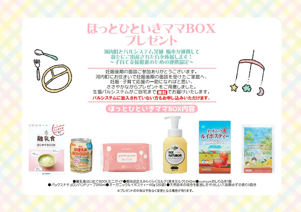 この協定の趣旨は、行政と生協の協力を通じて、地域に住む市民が安心して子どもを育てられる環境を整えることです。具体的には、妊娠後期の女性に対し、「ほっとひといきママBOX」と呼ばれる子育てに役立つ商品をプレゼントとして配布します。このBOXには、母体をいたわる入浴剤やオーガニックティー、パルシステムオリジナルの商品のおしりふきが含まれています。