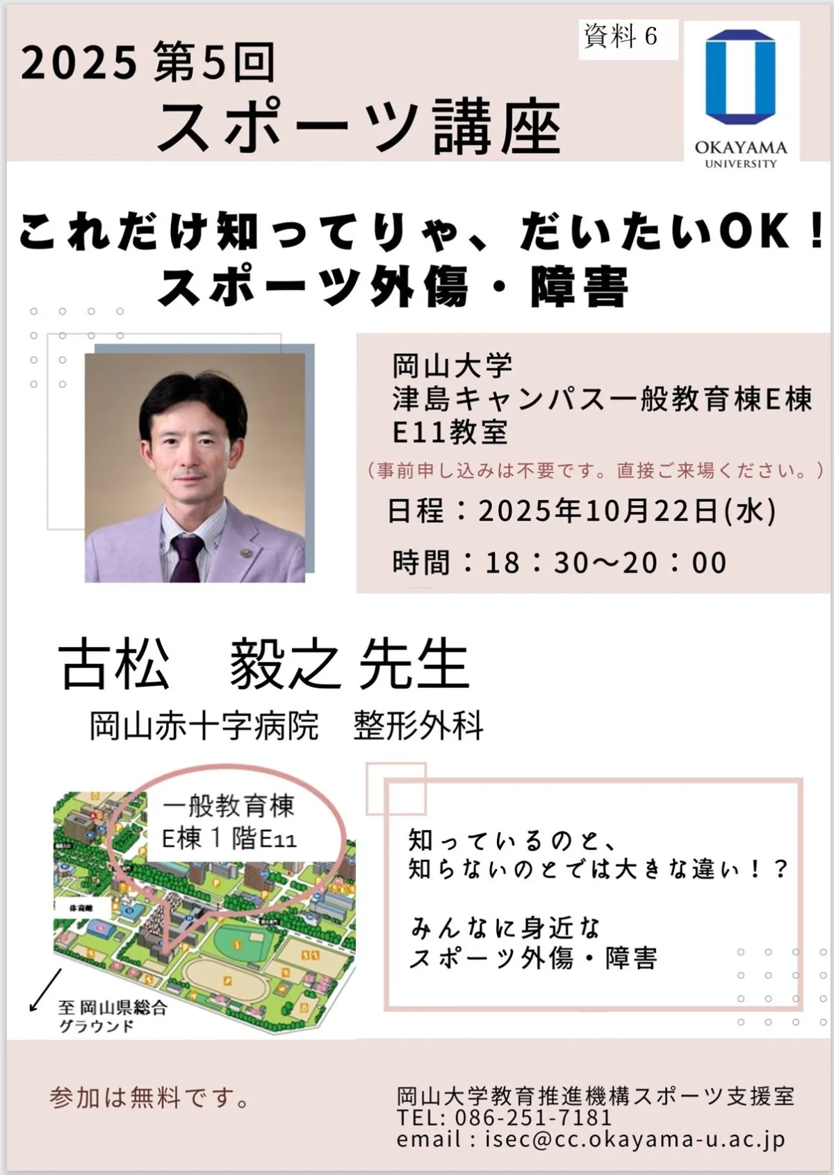 今回の講座は岡山大学教育推進機構スポーツ支援室が主催し、整形外科の専門家である古松毅之先生により講義が行われます。講座は18:30から20:00までの1時間半の予定で、参加費は無料です。事前申し込みは不要のため、興味のある方は直接会場にお越しいただければ参加できます。