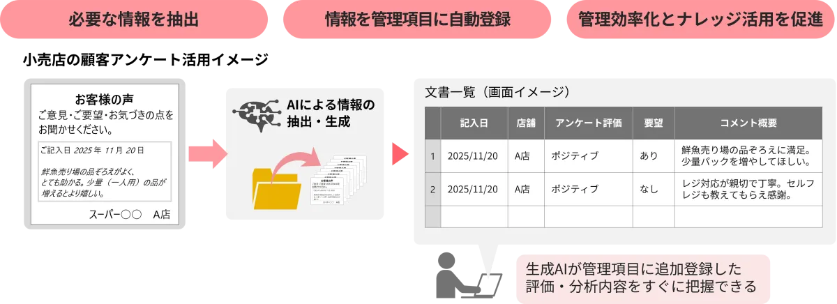 また、生成AIは文書の記載内容に基づいて情報を生成し、これを管理項目として登録できるため、業務の効率化が図られるだけでなく、ナレッジの活用も促進されます。たとえば、顧客向けの店舗アンケートから、店舗の評価や要望事項を生成AIが分析し、瞬時に情報をまとめることが可能になります。