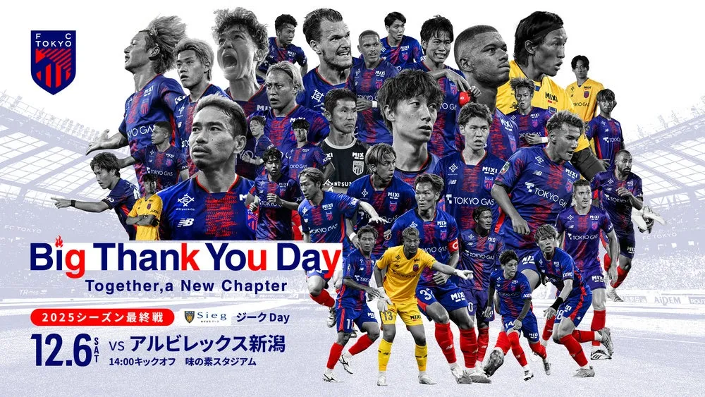2025年12月6日(土)に開催される、FC東京のホーム最終戦『Big Thank You Day』。この特別な日は、クラブを支えてくれる全てのサポーターと共に感謝の気持ちを分かち合う一日にしたいと考えています。テーマは『TOGETHER, A NEW CHAPTER』。イベントにはさまざまなコンテンツが用意されており、2026年の再スタートに向けてしっかりとつながりを深めていきましょう。