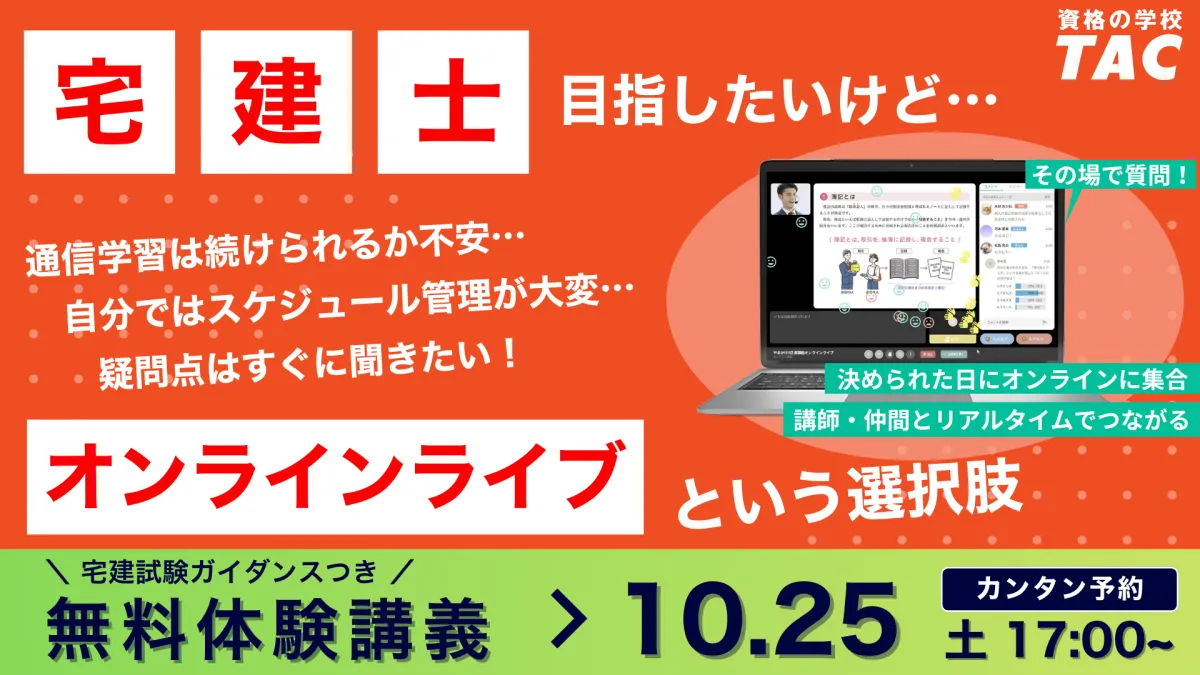 今すぐ、TACの無料オンラインセミナーに参加して、宅建士への第一歩を踏み出してみましょう。具体的な知識とやる気が得られるこの機会を、ぜひご活用ください。未来のキャリアに向けたスタートを、TACで切りましょう!
