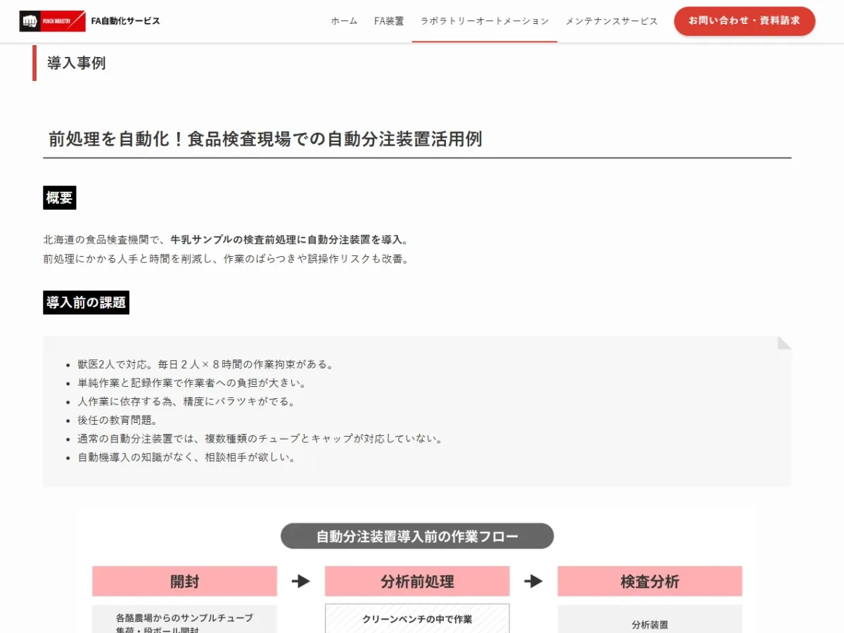 パンチ工業では、HPLCの前処理自動化をはじめとし、様々なプロセスでの自動化に取り組んでいます。具体例としては、材料開発や創薬開発分野での自動化も含まれています。これらのケーススタディは、特設サイトで詳しく紹介されています。