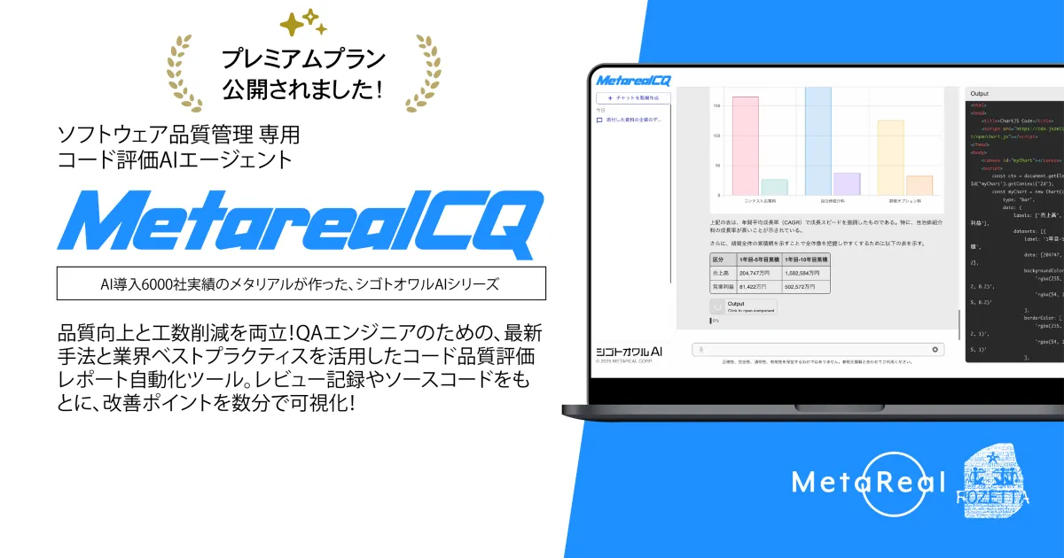 業界特化型のAI開発を手掛ける株式会社ロゼッタが、2025年8月12日から新たに提供するプレミアムプラン「Metareal コードクオリティ(Metareal CQ)」をご紹介します。本プランは、ソフトウェア開発におけるコード品質評価業務に特化したAIエージェントを利用し、開発現場の効率化を図ることを目的としたサービスです。月額5万円(税込)で、1日20回・月200回の利用が可能になっています。