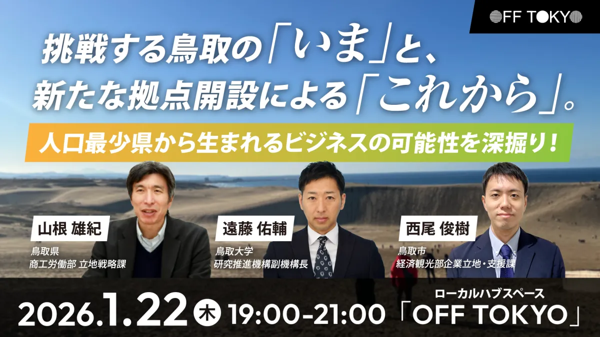 2026年、鳥取市に新たなビジネス・コミュニティ拠点、OFF TOKYOが開業します。この拠点は、ただのビジネスの場ではなく、“未来が巣立つ”ための重要な場所となります。都市部と地元企業の交流を促進し、新しい挑戦が生まれる場です。これを踏まえ、シビレ株式会社は2026年1月から3回にわたって、鳥取の現状と未来の可能性を探る連続イベントを開催します。