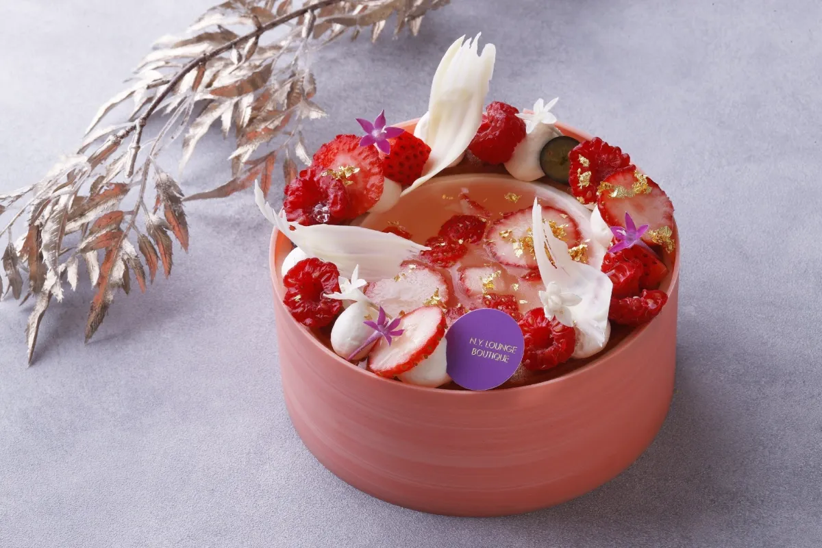 「ジュエル・ルージュ」は、贅沢さを演出した新年限定のケーキです。その美しさと味わいは、お正月の特別なひとときを提供します。中央には、甘さと酸味が絶妙に調和したストロベリージュレとストロベリームースが重ねられ、その周りにはクリーミーなフロマージュムースが包み込みます。さらに、トッピングには上品な香りのライチジュレが施され、美しい外見はチョコレートで仕上げられています。色とりどりの苺、ブルーベリー、ラズベリーがたっぷりとあしらわれ、金箔が加わることで新年の華やかさを強調しています。このケーキは、家族や友人とともに新年の食卓を華やかに飾ることでしょう。