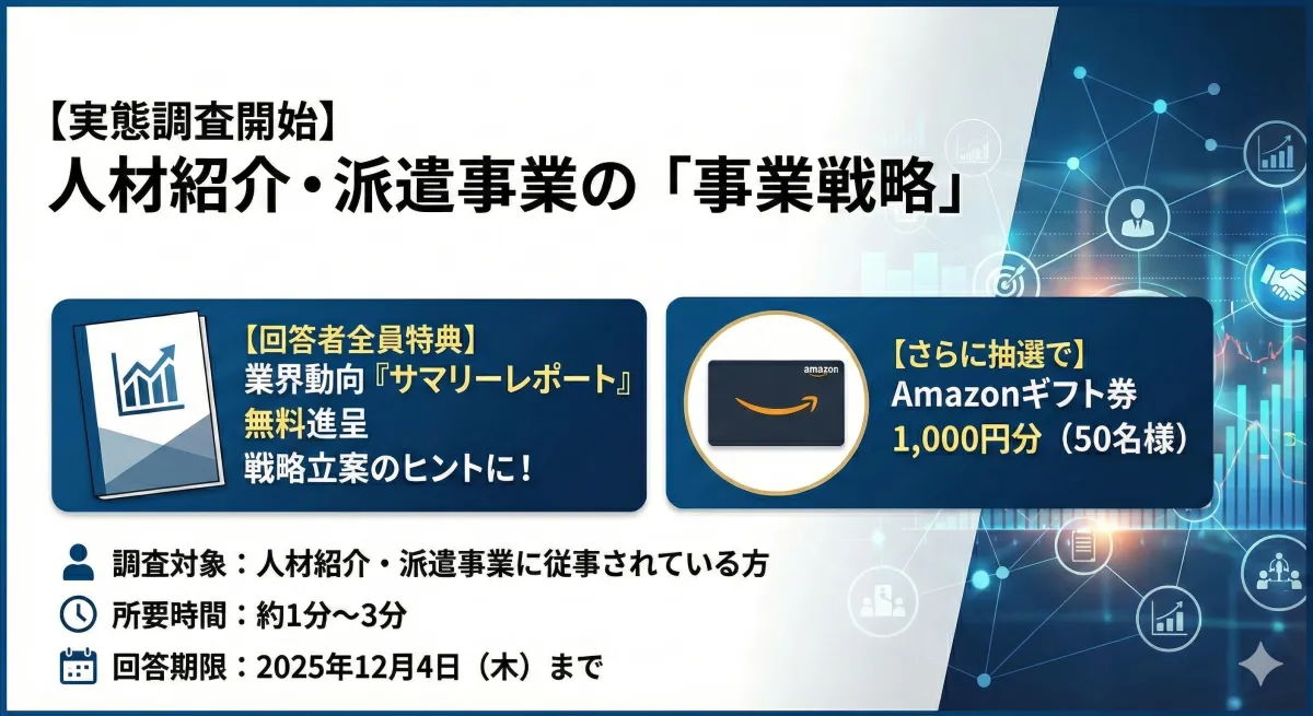 ポーターズ株式会社(以下、ポーターズ)は、人材紹介および派遣業務に特化した企業向けに、「事業戦略の現状に関する実態調査」を新たにスタートしました。この調査は、2025年12月4日まで実施され、参加いただいたすべての企業には『業界動向サマリーレポート』を無料で提供するという特典が用意されています。また、回答者の中から抽選で50名様には、Amazonギフト券1,000円分が授与されるキャンペーンも行われています。