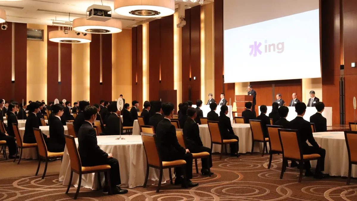 2026年4月1日、水ing株式会社が入社式を行い、72名の新入社員を正式に迎え入れました。会場は東京・汐留のコンラッド東京の2階にある「風波」で、特別な式典が執り行われました。代表取締役社長の安田真規氏が壇上に立ち、同社の企業文化を新入社員に伝える大切なひとときとなりました。