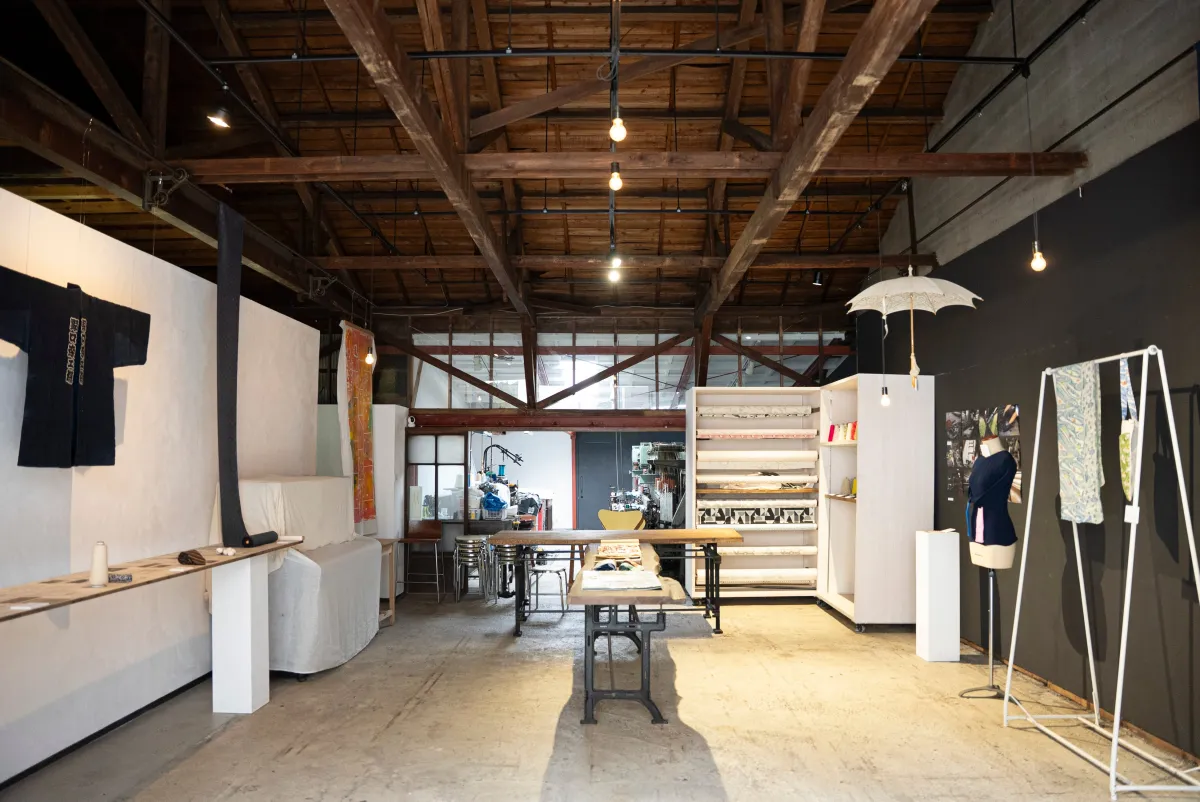 奥田染工場ではシルクスクリーンプリントを主力に、多岐にわたる布製品が日々生み出されています。工場内の「布類計画室」はリノベーションされたスペースで、展示活動やイベントの場として利用されています。ここでは八王子の布作りを支えてきた機械や歴史を保存し、次世代へと伝える使命も担っています。