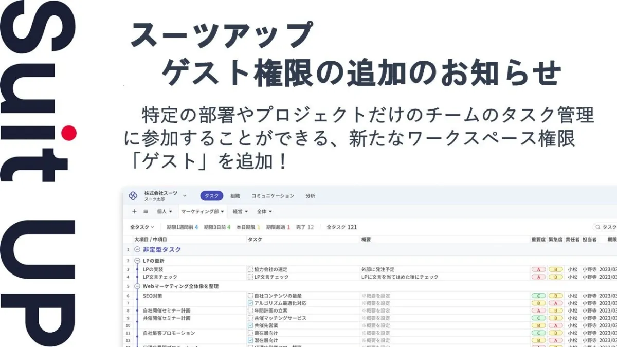 タスク管理やプロジェクト管理を効率化するツール「スーツアップ」が、新たにゲスト権限を導入することを発表しました。この新機能により、特定の部署やプロジェクトのみでのタスク管理が可能になり、社外の関係者も安心して参加できる環境が整います。